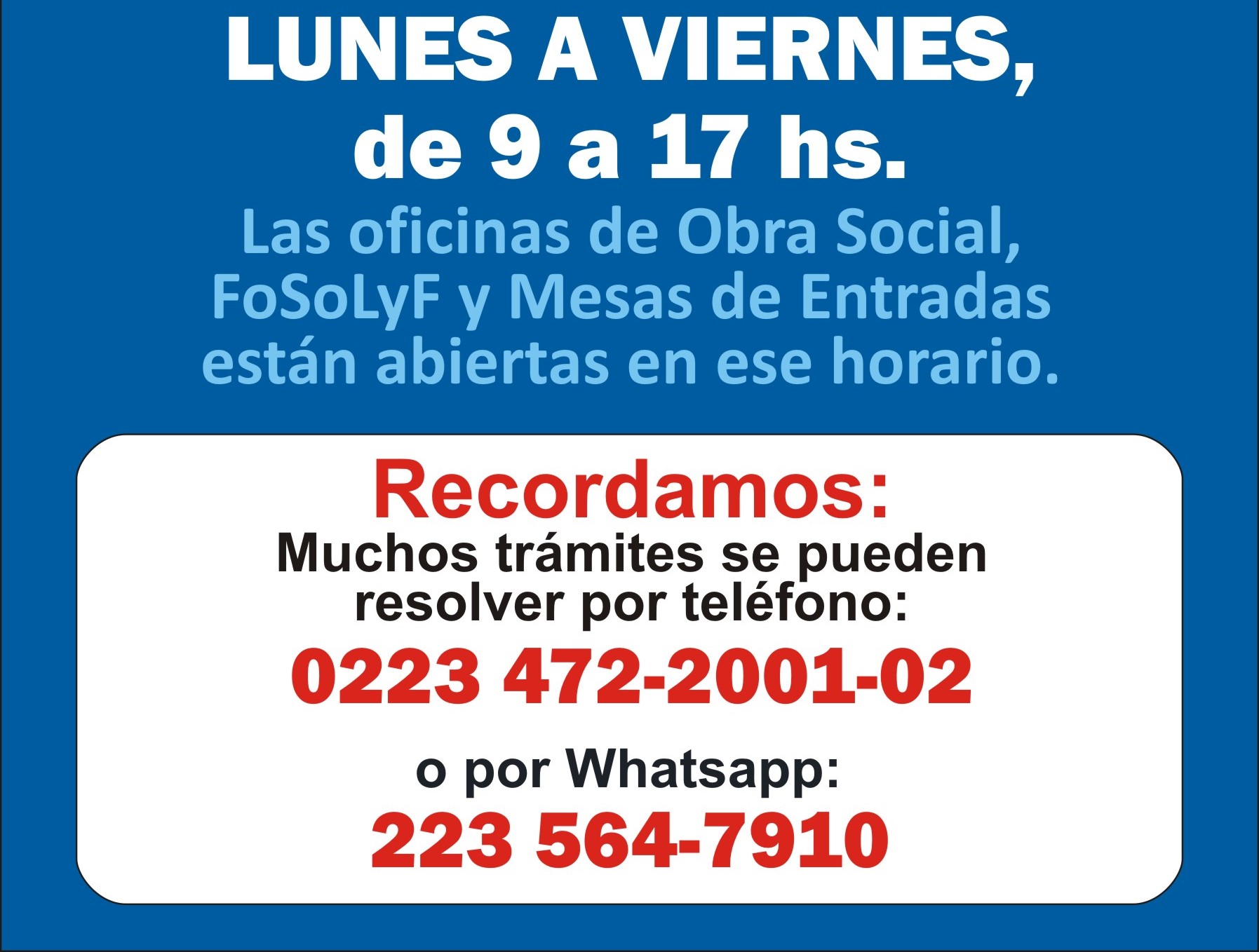 Horarios de atención: lunes a viernes de 8 a 17hs – 25 de Mayo 4115 – 1er piso – Mar del Plata